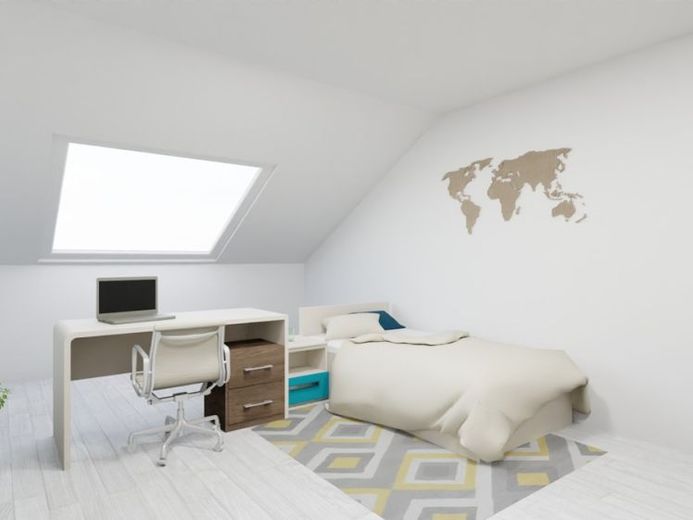 Der Fußboden wird mit Linoleum ausgestattet und die Wände werden weiß gestrichen.