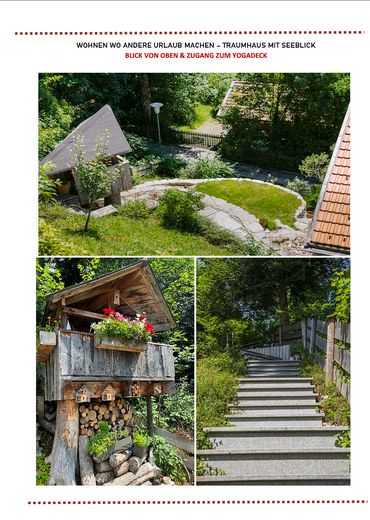 Der überdachte Südwestbalkon erstreckt sich über die gesamte Wohnfront und bietet zum Teil großzügige Tiefen. Im Erdgeschoss des Neubaus befindet sich eine Wohnung mit separatem Zugang. Das Grundstück verfügt über zahlreiche Terrassen und einen wunderschönen Garten mit Natursteinambiente. Der Traumplatz, der derzeit als Yoga- und Sunset-Deck genutzt wird, befindet sich im obersten Grundstücksteil. Von hier aus genießt man einen spektakulären Blick und traumhafte Sonnenuntergänge über dem See.