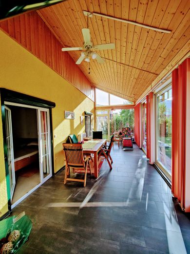 Im Erdgeschoss mit seinen 165 Quadratmetern befindet sich eine moderne, offene Küche mit großem Wohn-Essbereich, an den sich Hauswirtschaftsraum und Speisekammer anschließen. Schlafzimmer, Kinderzimmer und Arbeitszimmer sowie eine Gästetoilette und das geräumige, barrierefreie Bad sind ebenfalls im Erdgeschoss gelegen und bieten genügend Platz für die ganze Familie. Highlight ist der beheizbare Wintergarten mit fast 30 Quadratmetern: Im Sommer zum Garten geöffnet und im Winter als gemütliches Wohnzimmer wird er schnell zum Mittelpunkt des Hauses.