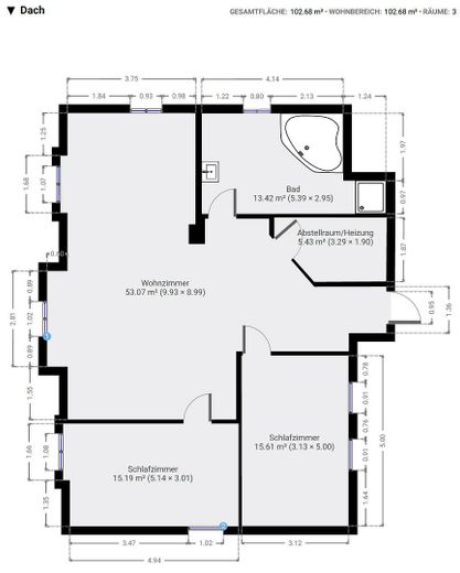 Die gesamte Grundfläche (inkl. aller Flächen unter Dachschrägen, Abstellräume etc.) beträgt 102 m².