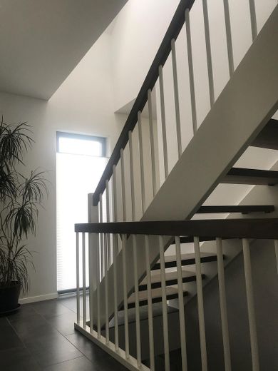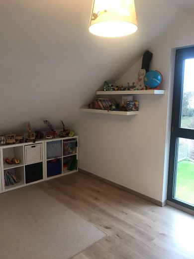 Im hellen Wohn- u. Esszimmer sind 3 Fenster bodentief mit SchiebKippTüre zur grosszügigen Süd- sowie einer weiteren Tür zur OstTerrasse. Von der Diele führt 1 Edelholz-Treppe in das 1. OG, wo sich 3 Zimmer befinden. Angrenzend an das Elternschlafzimmer steht Ihnen 1 Ankleidezimmer zur Verfügung. Einen Raum weiter kommen Sie in das grosszügig gestaltete FamilienBad mit Badewanne, separater ebenerdiger Dusche u. Doppelwaschbecken. Die Kinderzimmer/Büros liegen auf der anderen Seite: fast gleich groß, ebenfalls mit großen Fenstern u. Rollos sowie einer gemütlichen Dachschräge gebaut. Diese ist so hoch, dass man 1 Regal darunter stellen kann. Durch die Deckenhöhe von 2,55 m u. die großzügigen Fensterflächen (zTbodentief) wirken alle Innenräume größer als es die Wohnfläche erwarten lässt.