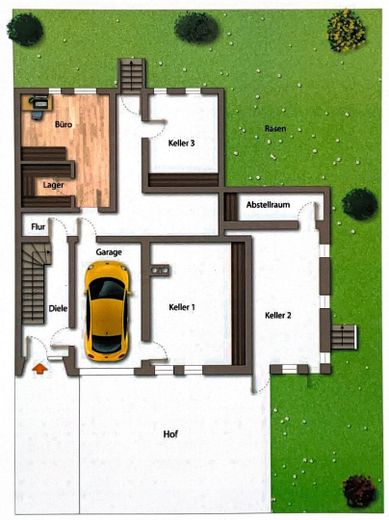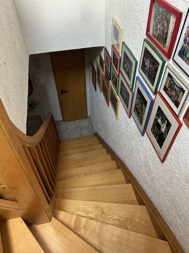 Im Untergeschoss befindet sich eine integrierte Garage mit direktem Hauszugang, großer Keller, Büro/Hobby /oder Gäste Raum, Wäscheraum, , Holzlager mit Brennstelle des zentralen Kachelofen, Technikraum mit Übergabestation der Nahwärme.