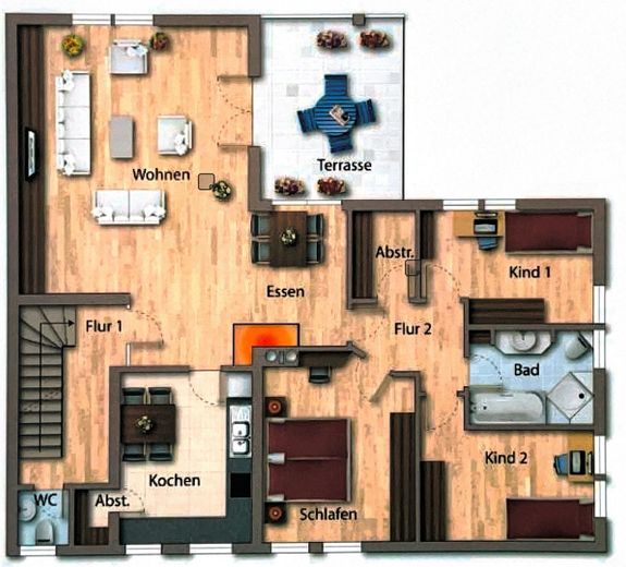 Zentraler Holzkamin (Grundofen zugelassen), sorgt für gemütliche Wärme im ganzen Haus, (Brennstelle ist