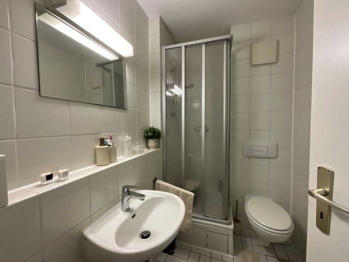 Das Badezimmer bietet mit seinen gefliesten Wänden und dem zeitlosen Design einen weiteren Höhepunkt der Wohnung. Es vereint Funktionalität mit einem Hauch von Eleganz und bietet somit einen angenehmen Raum für die tägliche Pflege.