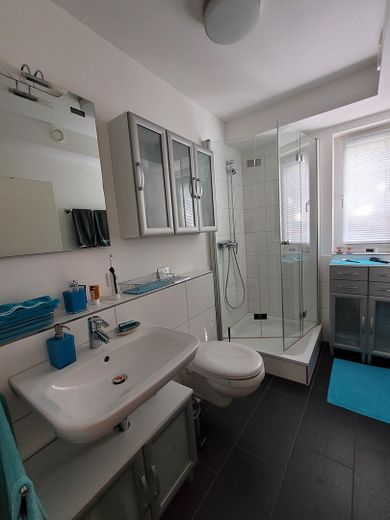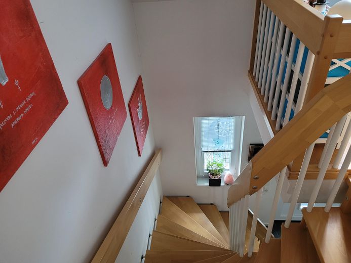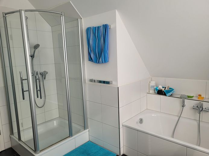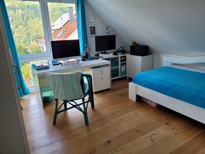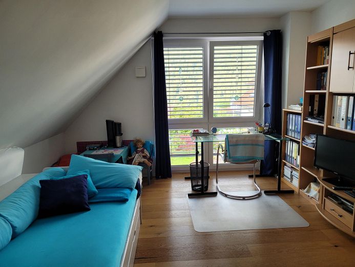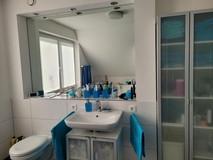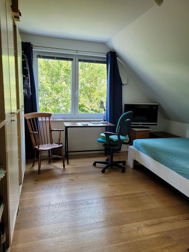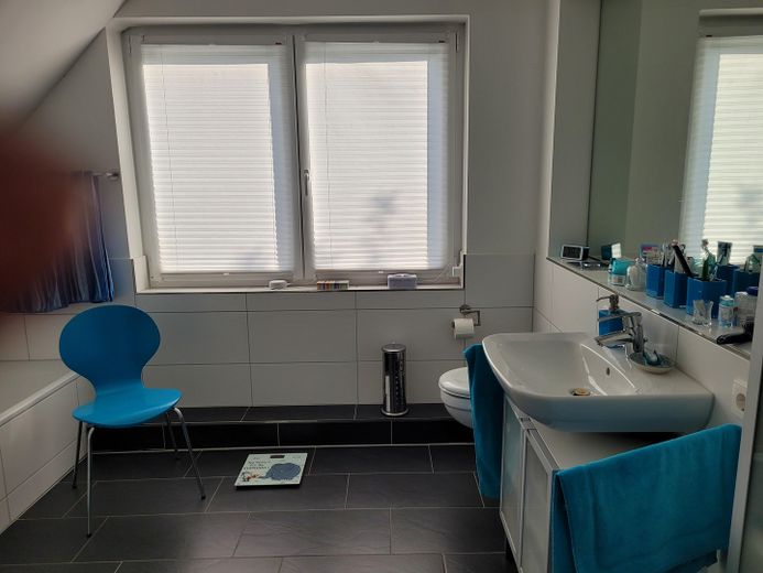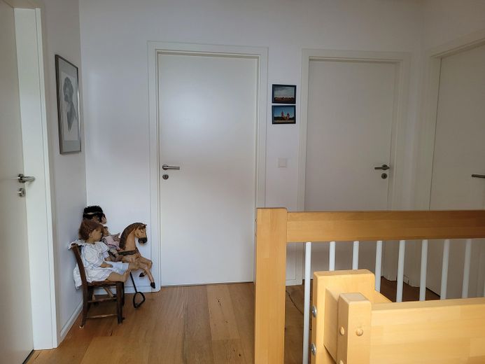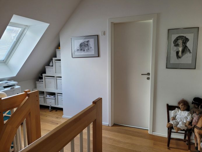 OG: 3 Schlafräume, großes Bad mit Dusche und Badewanne. Zusätzlicher Stauraum auf dem Dachboden. In allen Wohnräumen liegt Eichenparkett, in Diele, Hauswirtschaftsraum, Küche und Bäder sind hochwertige Fliesen. Elektrische Außenjalousien stehen zur Beschattung oder ggf. Verdunklung zur Verfügung.