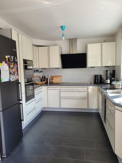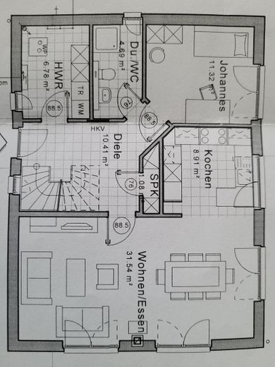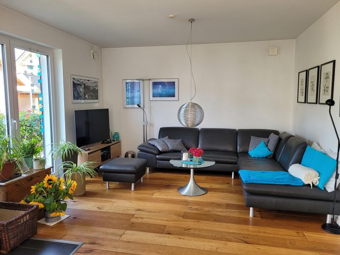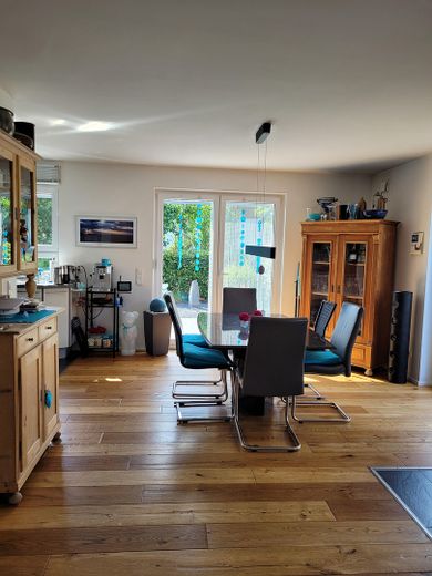 Der offen gestaltete Wohn-/Essbereich mit integrierter Küche bildet das Herzstück des Hauses und öffnet sich zur sonnigen Südwest-Terrasse, ein idealer Ort zum Entspannen oder für gesellige Stunden. Große Fensterflächen schaffen eine angenehme Wohnatmosphäre mit viel Tageslicht.