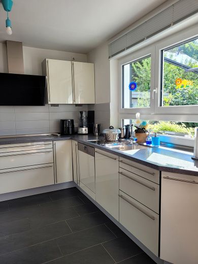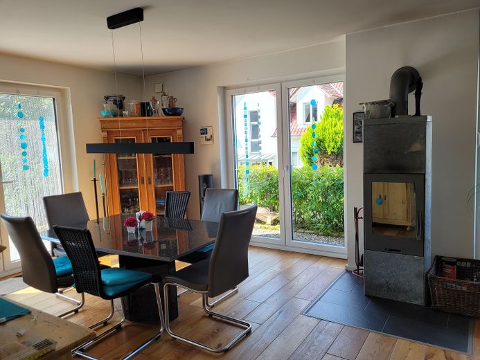 3-schalige Massivbauweise, 3-fach verglaste Fenster, Fußbodenheizung, Wärmepumpe, Specksteinofen, Eichenparkett, hochwertige Einbauküche mit Miele, Neff und Siemensgeräten, einschl. Dampfgarer, Hauswirtschaftsraum, elektrische Außenjalousien. schön angelegter Garten mit Terrasse, Pergola-Markise, Terrasse, Garten.