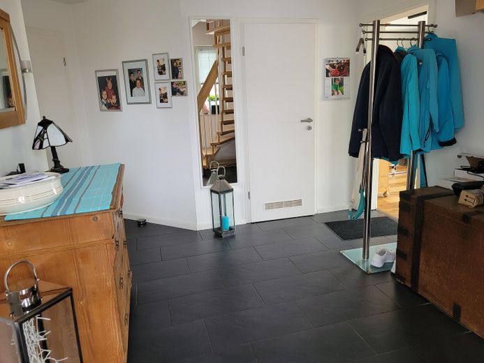 EG: großzügige Diele, Duschbad, Hauswirtschaftsraum, Schlaf-/Arbeitszimmer, Wohn-/Esszimmer mit integrierter, hochwertiger Einbauküche. Ein Specksteinofen im Wohnzimmer sorgt für zusätzliche Gemütlichkeit.