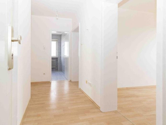 Die Wohnung bietet zwei gut geschnittenen Schlafzimmer, ein Wohnzimmer mit überdachtem uneinsehbaren Balkon, eine großzügige Küche, einen Flur mit einer Nische, die Platz für eine Waschmaschine und einen Garderobenschrank bietet, ein Badezimmer mit Wanne und Fenster und ein separates WC.
