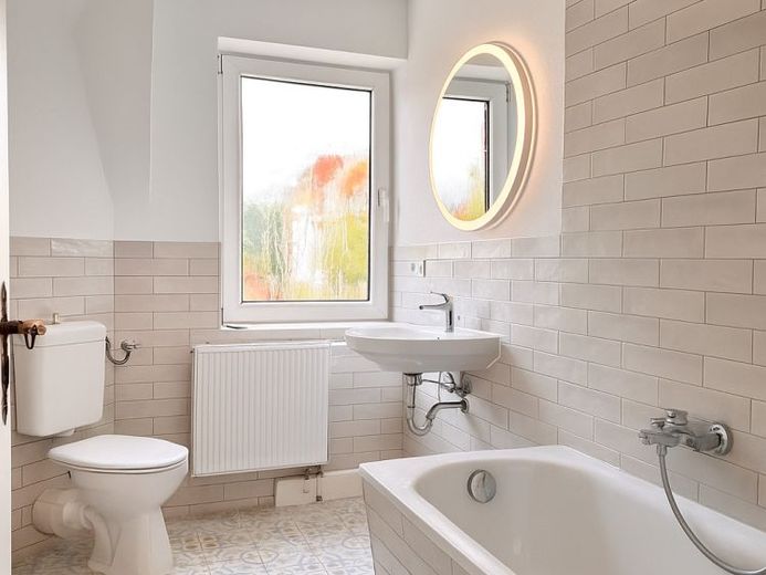 Das absolute Highlight ist das Badezimmer, das mit einer erstklassigen Badausstattung aufwartet. Hier finden Sie eine großzügige Badewanne sowie stilvolle Fliesen verleihen dem Raum eine besondere Atmosphäre.