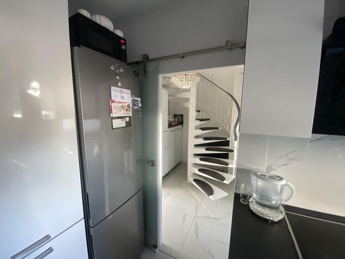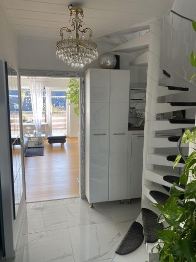 Alle Zimmertüren wurden in Weiß mit Chrom-Zierleisten oder als Glastüren ausgeführt. Wenn sie den Eingangsbereich betreten sehen sie zwei ungewöhnlich schöne edle Glastüren. Die Wendeltreppe erstrahlt in hellem weiß mit WLAN schaltbarer RGB-Beleuchtung.Das neue 140x200m Gäste-Hochglanz Wandklappbett kann gegen Kostenbeteiligung übernommen werden.