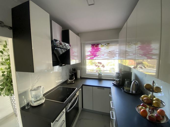 Im 2.Obergeschoss befindet sich ein großes Wohn/Esszimmer mit Zugang zur großen Terrasse, eine geräumige moderne Küche mit weißen Hochglanz- Möbeln einer anthrazitfarbenen Arbeitsplatte und Miele Herd+SPM und Edelstahl Kühlschrank,ein edles Gäste-WC und die Wendeltreppe zum 3 OG.