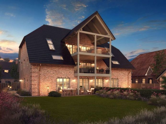 Die Wohnung entsteht im Effizienzhausstandard KfW 55 und wird mit einer Erdwärmepumpe und Fußbodenheizung in allen Räumen ausgestattet, die jeweils über Raumthermostate steuerbar ist. Antiker Verblender „Westerhever“, Rundbogenfenster und eine klare, moderne Formensprache verleihen dem Haus einen unverwechselbaren nordfriesischen Charakter.