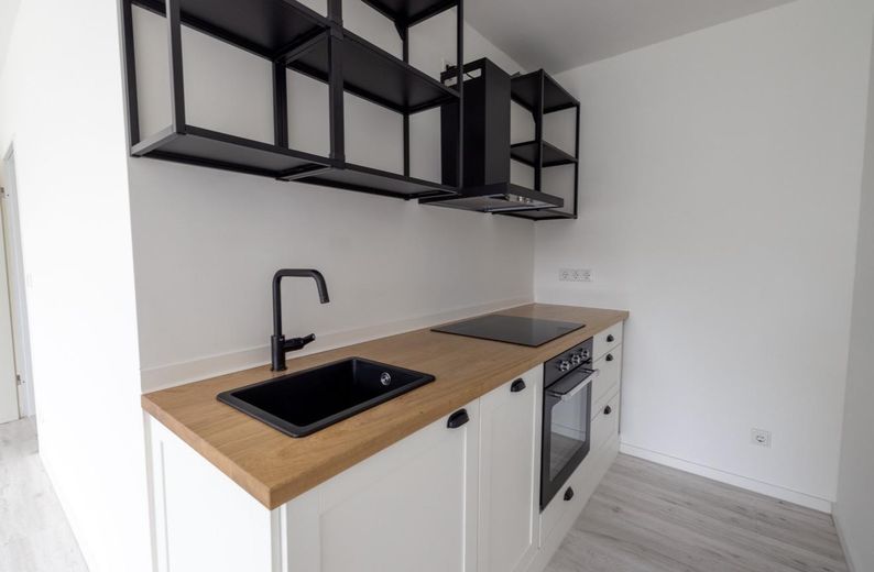 Auch die Einbauküche wurde mit Bedacht gewählt- so passt sich die Küche in Farbe und Form der übrigen Wohnung an und integriert sich damit als Herzstück wie maßgeschneidert in den Flair der Wohnung.