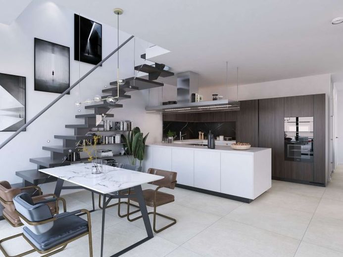 Der Mittelpunkt des Lebens ist der großzügige, offene Wohnbereich mit direktem Zugang zur Dachterrasse – perfekt, um den Tag entspannt ausklingen zu lassen. Die angrenzende Küche fügt sich harmonisch in das Raumkonzept ein und schafft eine offene, einladende Atmosphäre.