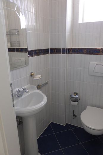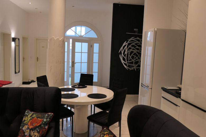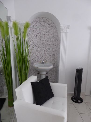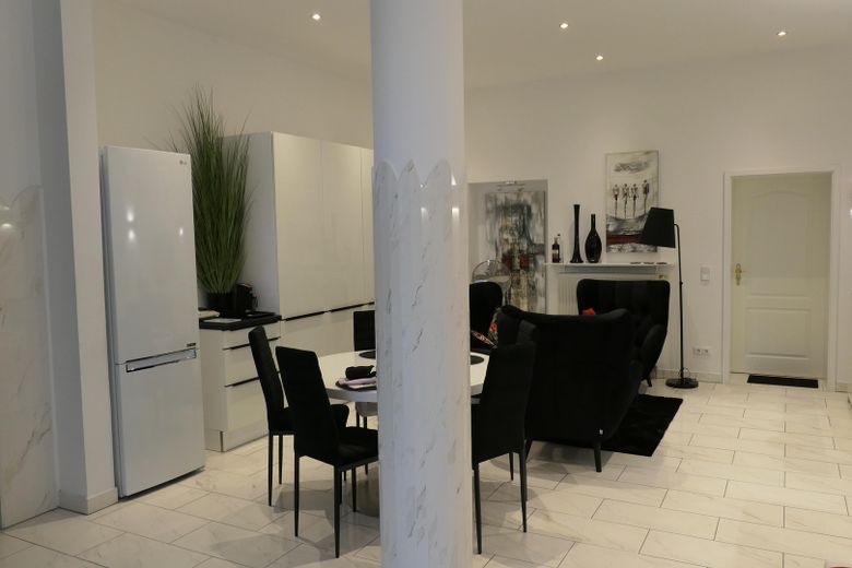 Im Empfang befindet sich eine eingebaute Küche mit allen Geräten sowie ein Gäste-WC mit Gianni-Versace-Fliesen.