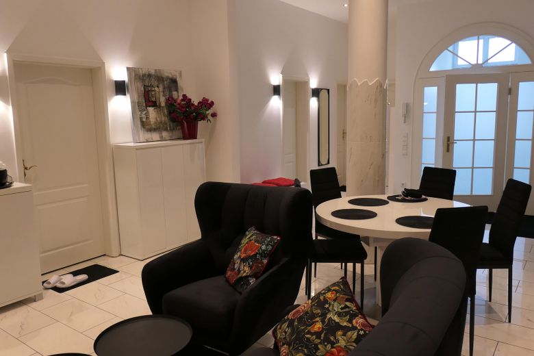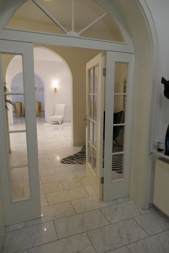 Die offenen Räume benötigen Trennwände aus Glas oder Trockenbau. An den Decken und Wänden befinden sich sehr hochwertige Lampen mit Goldbeschichtung. Stillvolle Türen und vergoldete Handgriffe betonen die Eleganz der Räume. Balkon- oder Austrittanbau möglich.