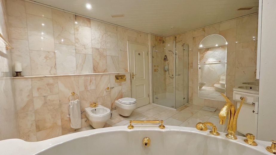 Fußbodenheizung, offener Kamin, französische Fenster, hochwertiger Bodenbelag aus Naturstein, Bad aus echtem italienischen Marmor, Badewanne aus echtem Marmor, Einbauküche mit Markengeräten inklusive.
