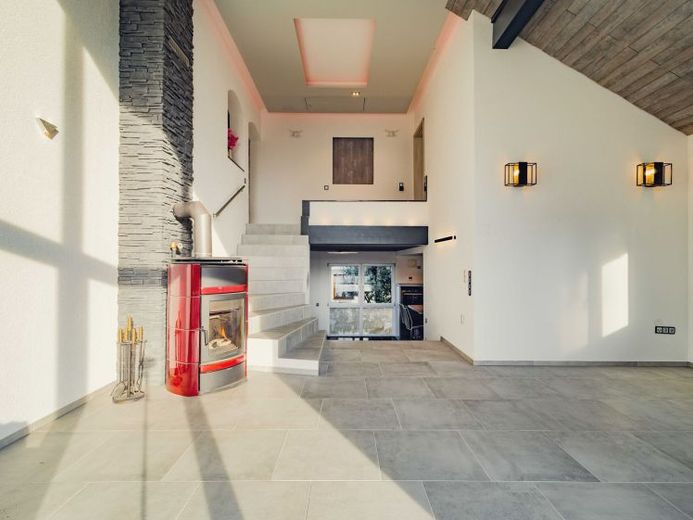 Das Herzstück des Hauses ist das beeindruckende Wohnzimmer mit sehr hohen Decken, wasserführendem Kamin 20 kW und einer großflächigen Fensterfront – lichtdurchflutet und voller Wohnqualität. Hier ist Wohlfühlatmosphäre garantiert. Von hier aus besteht zudem die Möglichkeit, eine Terrasse anzubauen.