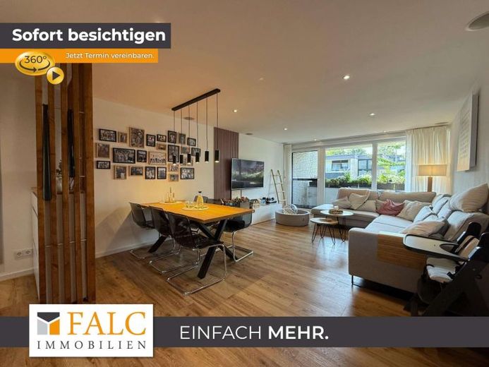 Das Wohnzimmer besticht durch seine Helligkeit und den direkten Zugang zum Balkon, der sich ideal für entspannte Stunden im Freien eignet. Der offene Wohn- und Essbereich ist mit einem hochwertigen Bodenbelag ausgestattet, der Wärme und Gemütlichkeit ausstrahlt.Die bodentiefen Fensterfronten in allen Räumen lassen viel Tageslicht herein und bieten einen schönen Ausblick ins Grüne.