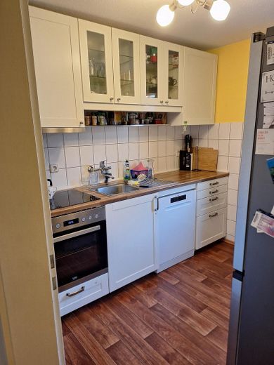 Eine Einbauküche ist vorhanden, ebenso wie ein großer Balkon und der Garten wird gemeinschaftlich genutzt.