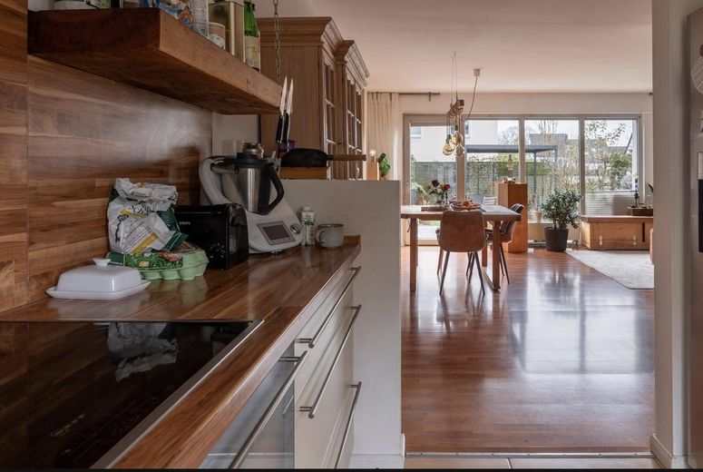 Bereits der gepflegte Vorgarten vermittelt einen freundlichen ersten Eindruck. Im Erdgeschoss erwartet Sie ein großzügiger, lichtdurchfluteter Wohn- und Essbereich mit Kamin und direktem Zugang zur sonnigen Terrasse und dem charmanten Garten. Die Kombination aus Holzterrasse, Grünfläche und gemütlicher Sitzecke schafft einen perfekten Ort zum Entspannen oder für gesellige Stunden. Die offene Einbauküche integriert sich harmonisch in den Wohnbereich. Ein Gäste-WC ergänzt das Erdgeschoss.