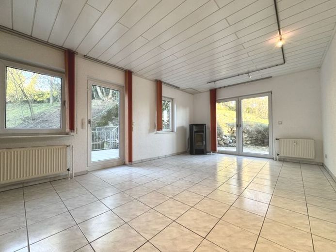 Weiter den Flur entlang, erreichen Sie den Wohn-/Essbereich, der mit einem Pellet-Heizofen ausgestattet ist und für gemütliche Abende betrieben werden kann. Von den großen Türen aus betreten Sie die beiden großen Terrassen, die sich über zwei Seiten der Wohnung erstrecken. Ein Gartenhaus steht Ihnen ebenfalls zur Verfügung.