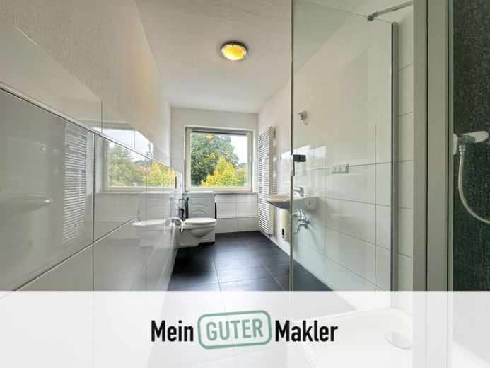 Links vom Flur liegt das modern geflieste Tageslichtbad mit Dusche. Ein praktischer Handtuchheizkörper sowie der integrierte Waschmaschinenanschluss sorgen für Komfort im Alltag. Direkt angrenzend befindet sich die Küche, vorbereitet mit allen notwendigen Anschlüssen und einem pflegeleichten Fliesenspiegel – ideal, um sie nach eigenen Vorstellungen auszustatten.