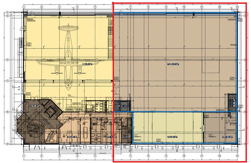 Die verfügbaren Flächen befinden sich in einem multifunktionalen Gebäude, bestehend aus Hangarbereich, Werkstätten, Zwischengeschoss und Obergeschoss.