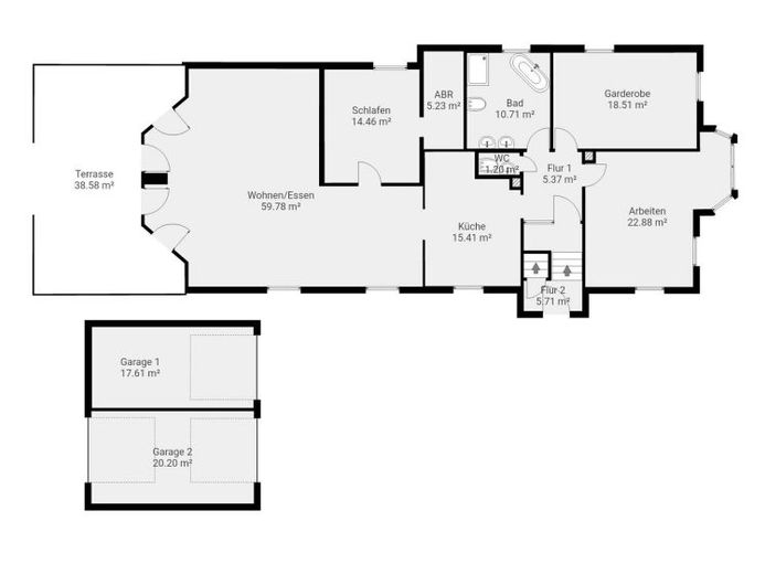 Die Erdgeschosseinheit verfügt über großzügige 178,35 m² Wohnfläche. Die zweite Wohneinheit erstreckt sich auf das Obergeschoss und Dachgeschoss, mit einer Gesamtfläche von 138,41 m².