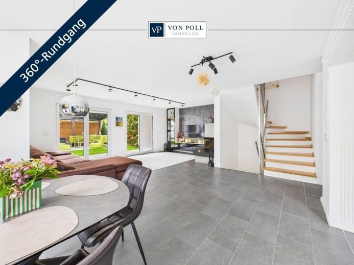 Das Herzstück des Hauses ist der großzügige, lichtdurchflutete Wohn- und Essbereich mit Kamin sowie Zugang zur sonnigen Terrasse und in den Garten. Bodentiefe Fenster tauchen den Raum in warmes Tageslicht und schaffen eine offene, einladende Wohnatmosphäre. Der Kamin verleiht dem Wohnbereich zusätzlich eine behagliche Wärme und macht ihn zum idealen Ort für entspannte Stunden.