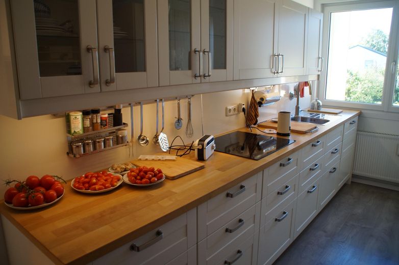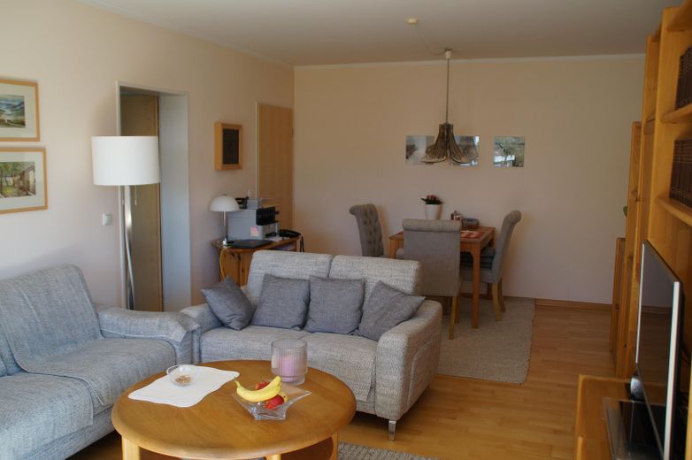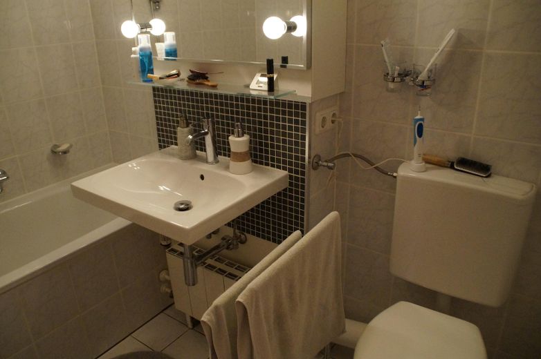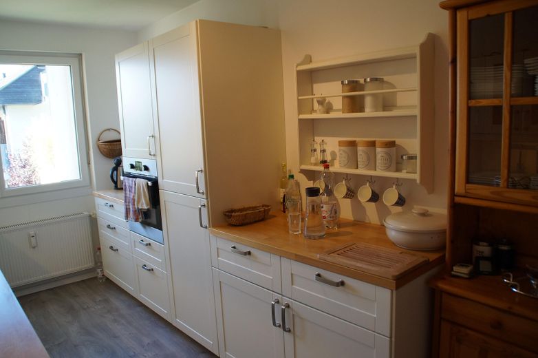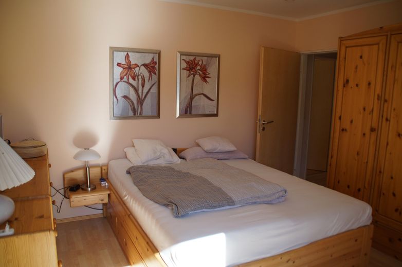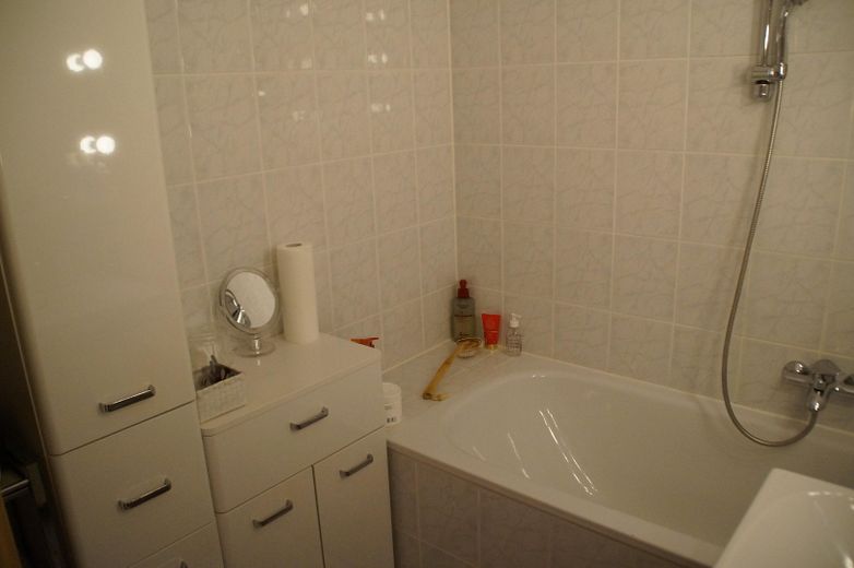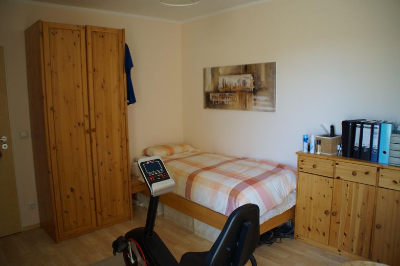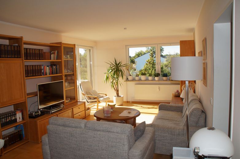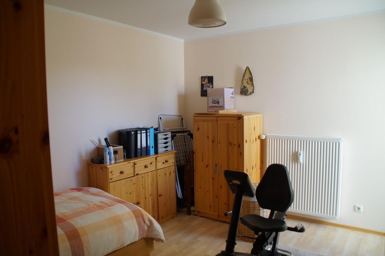 Das helle Wohnzimmer ist mit Parkett ausgestattet und hat Zugang zur sonnigen Terrasse. Beide Schlafzimmer haben Zugang zum Balkon. Sämtliche Zimmer sind mit Laminat ausgelegt. Es gibt ein Bad mit Badewanne und ein Gäste-WC.
