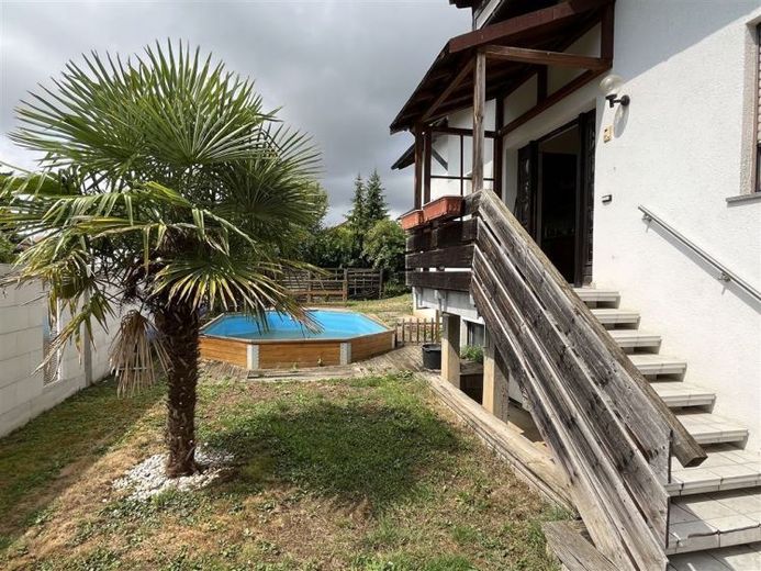 Zum Haus gehört ein Gartengrundstück mit Terrasse, überdachter Freisitz, ein Swimmingpool eine große Doppelgarage, Carport, Fertiggarage sowie Stellplätze.