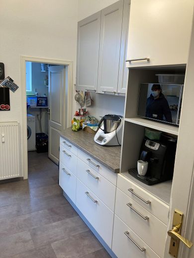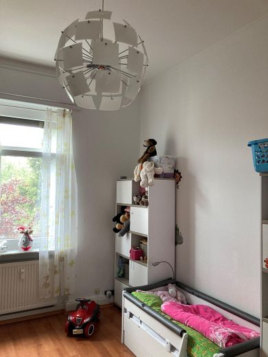 Die Wohnung ist mit Parkett ausgestattet und mit vier fast gleich großen Zimmern perfekt für kleine Familien oder junge Paare, welche ein Arbeitszimmer benötigen, geeignet. Highlight ist zweifelsfrei die Küche, welche zum gemeinsamen Kochen einlädt. Besonderen Flair bietet das Erkerzimmer mit dem Blick zur ev. Kirche, welches als Lese- oder Spielecke die Wohnung zu etwas besonderem macht. Die hohen Decken runden die Wohnung für jeden Altbauliebhaber der nicht quadratisch, praktisch, gut wohnen möchte, ab.