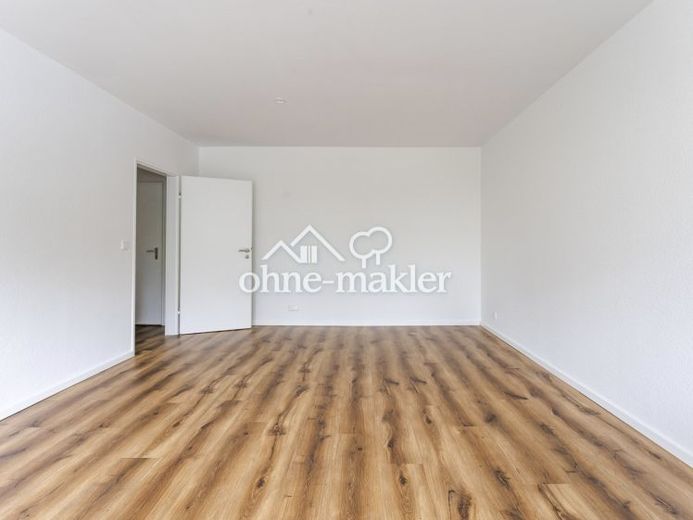 Der kombinierte Wohn- und Schlafbereich wirkt dank des neuen Bodenbelags hell und einladend. Die separate Küche sorgt für eine klare Trennung zwischen Wohnen und Kochen.