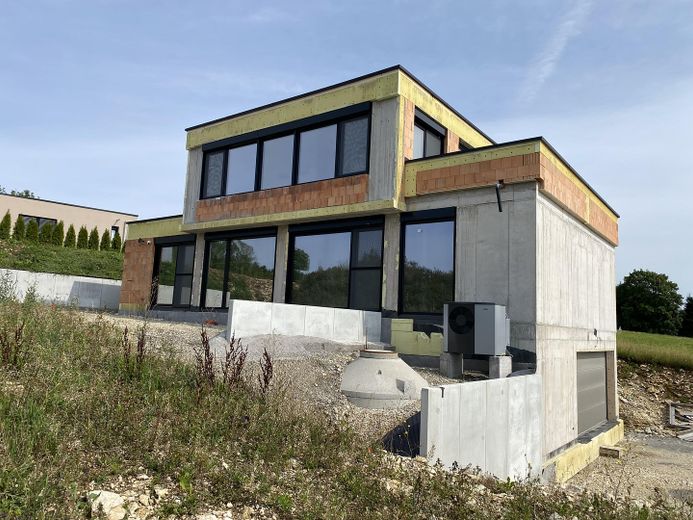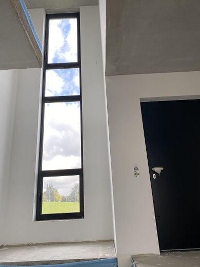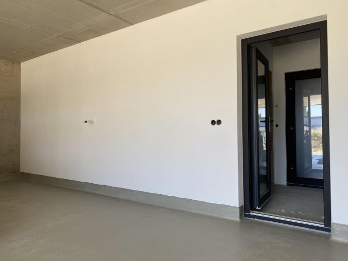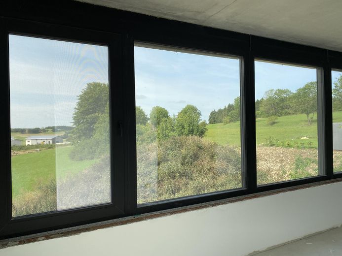 Die Fenster und Terrassentüren bestehen aus VEKA-Kunststoffprofilen in der Ausführung „Black Matt Ultimat“, sind mit All-Seasons-Verglasung ausgestattet und verfügen über integrierte Fliegengitter sowie Raffstores mit Fernbedienung..