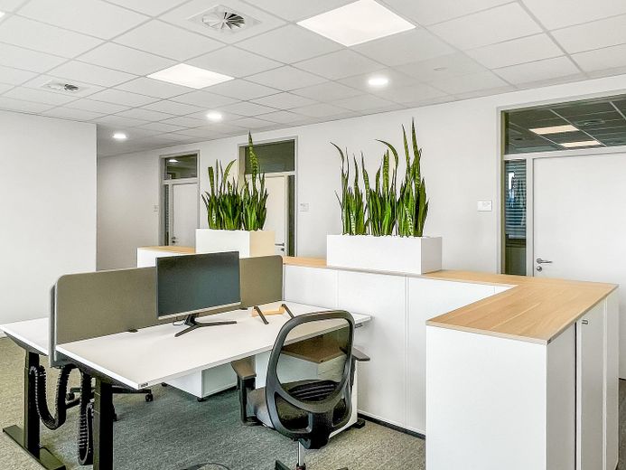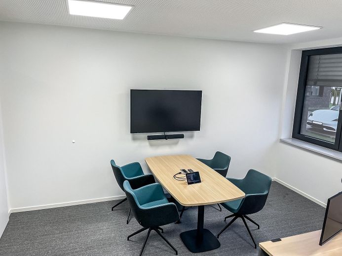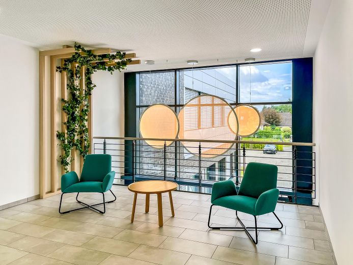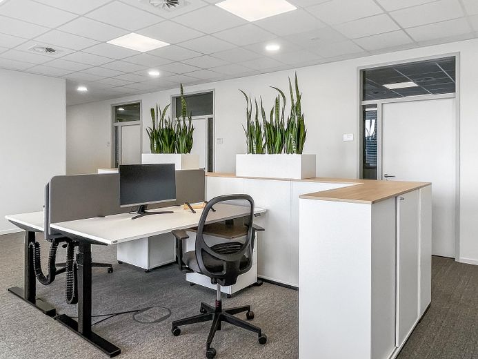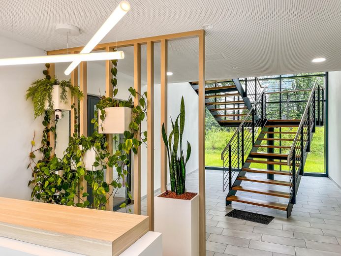 Zum Verkauf steht ein modernes Bürogebäude (Baujahr 2023) mit 1.245 m² Gesamtfläche auf einem Grundstück mit 3.236m², aufgeteilt in vier Gebäudeflügel.