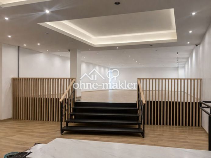 Der untere Bereich eignet sich ideal für Empfang, Kundenbereich oder offene Arbeitsflächen. Über eine repräsentative Design-Treppe gelangt man in das Obergeschoss, das sich als ruhiger Arbeits-, Behandlungs- oder Präsentationsbereich nutzen lässt.