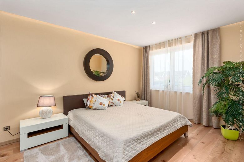 Fünf Schlafzimmer, zwei Bäder sowie ein separates Gäste-WC bieten ausreichend Platz für Familie, Gäste oder Homeoffice. Bodentiefe Fenster sorgen für lichtdurchflutete Räume und eine angenehme Wohnatmosphäre.