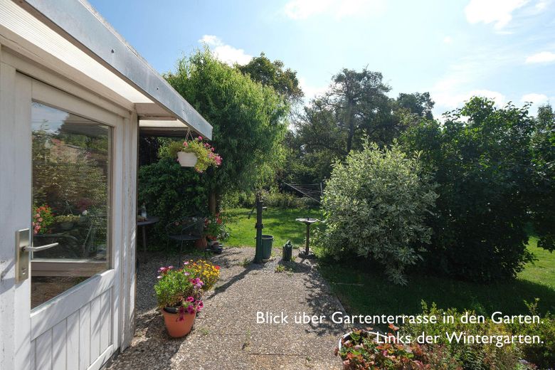 Eine zweite Terrasse mit Wintergarten lädt zum Verweilen ein. Dahinter folgt ein Nachbargarten – danach beginnen bereits Wiesen und Felder.
