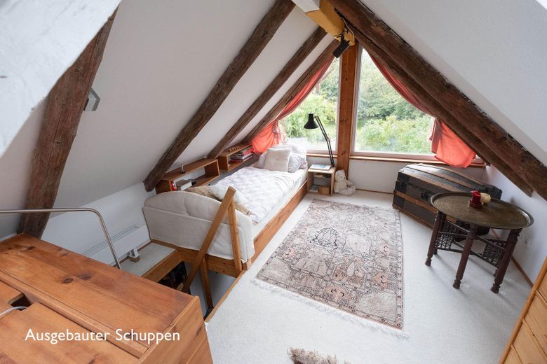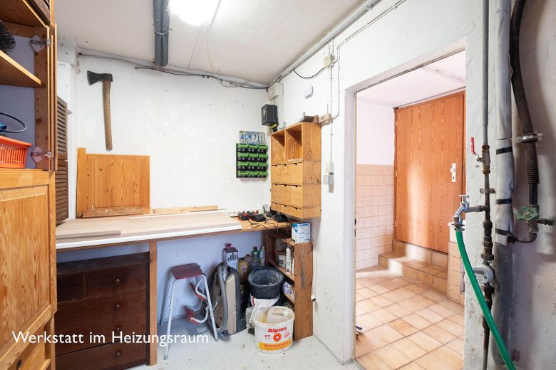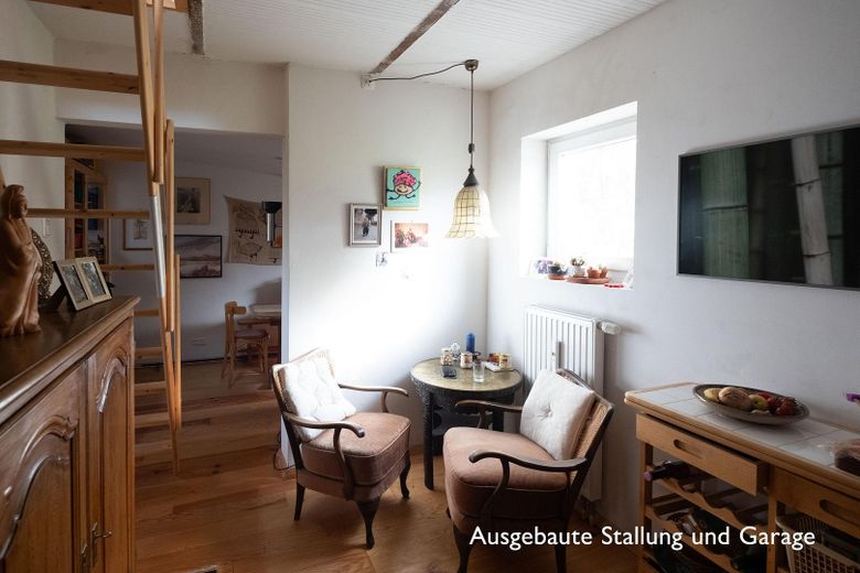 Im Nebengebäude befinden sich eine Waschküche, der Heizungsraum (auch als kleine Werkstatt nutzbar) sowie ein ca. 30 m² großer, liebevoll ausgebauter Raum, der aus einer ehemaligen Garage und Stallung entstanden ist – ideal als Atelier, Rückzugsort oder zur Unterbringung von Gästen.