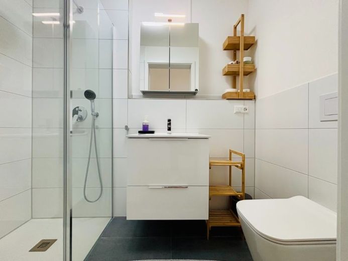 • Badezimmer mit bodentiefer Dusche, Waschbecken mit Unterschrank und Hänge-WC sowie Handtücher und Badvorleger inklusive