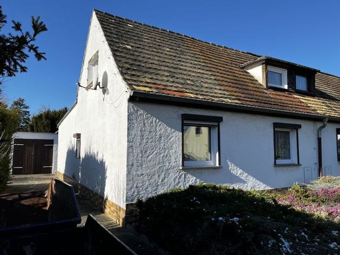Die Doppelhaushälfte wurde um 1935 erbaut und ca. 1970 um einen Anbau auf die jetzige Wohnfläche erweitert. Im Erdgeschoss befindet sich Flur, Wohnen, Schlafen, Bad mit Wanne, ein zweites Bad mit Dusche und die Küche. Über eine sehr gut begehbare Treppe gelangt man ins Dachgeschoss in dem sich zwei weitere Zimmer befinden.