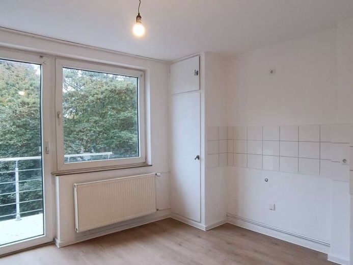 Zur linken Seite befindet sich die geräumige Küche, die mit einem großen Fenster ausgestattet ist und viel Tageslicht hereinlässt. Dieser Raum bietet ausreichend Platz für eine gemütliche Essecke und einer großen Küchenzeile. Außerdem können Ihre Vorräte im Einbauschrank mühelos verstaut werden. Von der Küche haben Sie Zugang zum sanierten Balkon, der einen herrlichen Blick ins Grüne bietet.