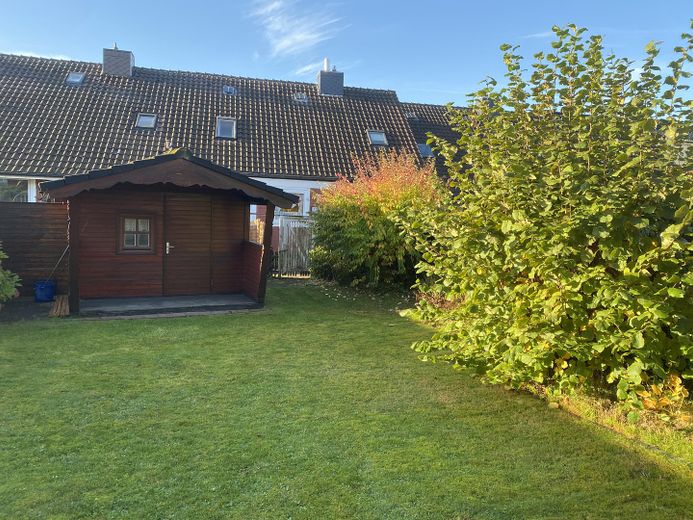 Vom wunderschönen Wintergarten gelangt man in den Garten mit Holzschuppen und einer kleinen Terrasse.