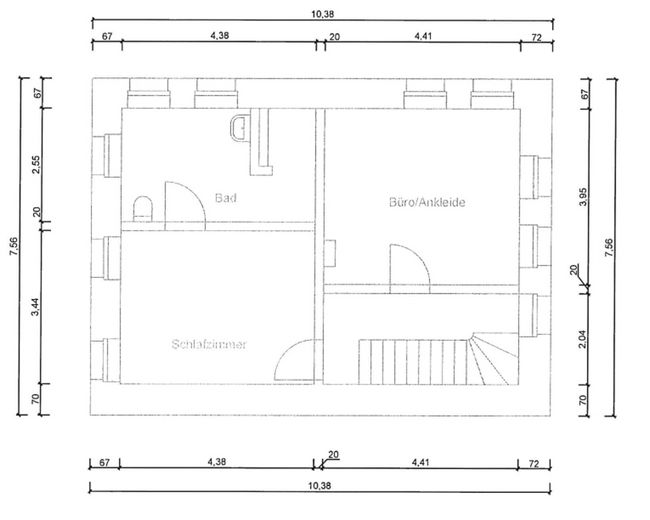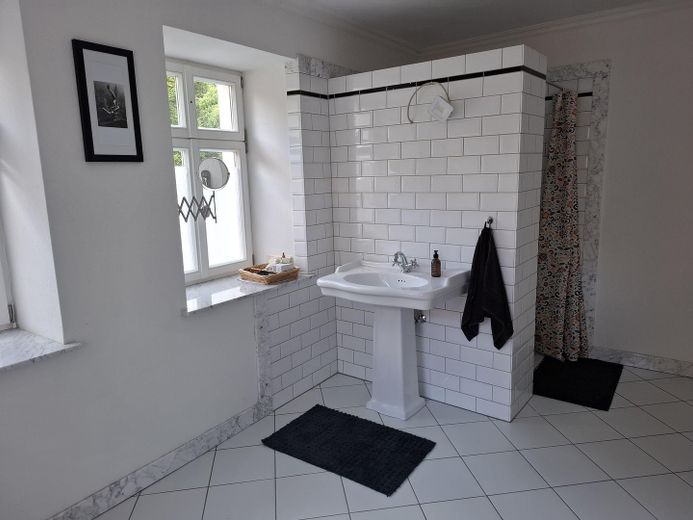 Alle Bäder sind mit Pariser Metrokacheln gefliest. Stellen außerhalb des Naßbereiches sind tapeziert, dann aber -passend zu den Marmorfensterbänken-mit Marmorbesatz abgerundet. Im Gästebad EG sind Anschlüsse für eine weitere Dusche oder wahlweise auch Badewanne vorhanden. Der Platz reicht für das Eine oder das Andere aus.