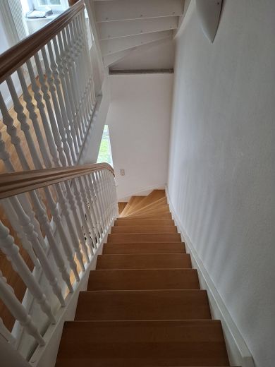 Die beiden stilvollen Holztreppen verbinden die drei Etagen miteinander. Im 1. OG befindet sich ein Schlafzimmer mit Badezimmer en suite. Ein weiterer Raum kann als weiteres Schlafzimmer, Ankleidezimmer oder Arbeitszimmer genutzt werden.