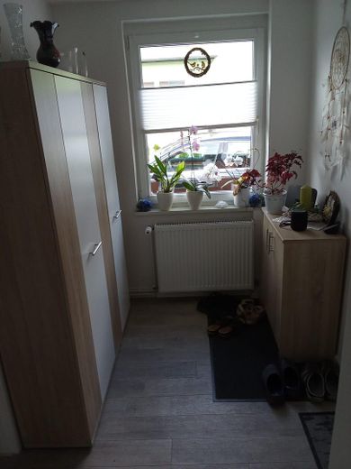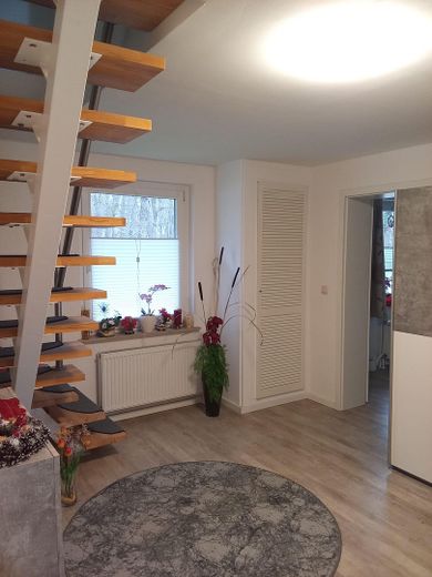 Im Erdgeschoss befinden sich das Bad mit Dusche, Küche mit Zugang zur Terrasse, Flur, Wohnzimmer sowie ein weiteres Zimmer.