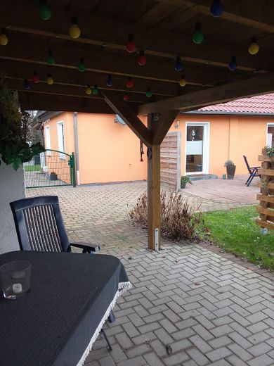 Im Garten bietet ein kleiner Carport einen geschützten Sitzbereich