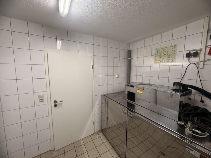 Der Thekenbereich ist zentral angeordnet und funktional nutzbar. Die Küche ist als klassische Gastronomieküche ausgestattet, mit Edelstahlflächen, Kühl- und Lagerräumen sowie einer sinnvollen Wegeführung.